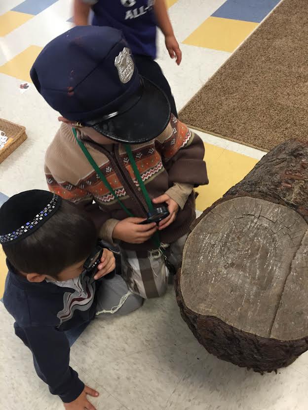 Levi and Shua using magnifying glasses to look closer at a tree stump