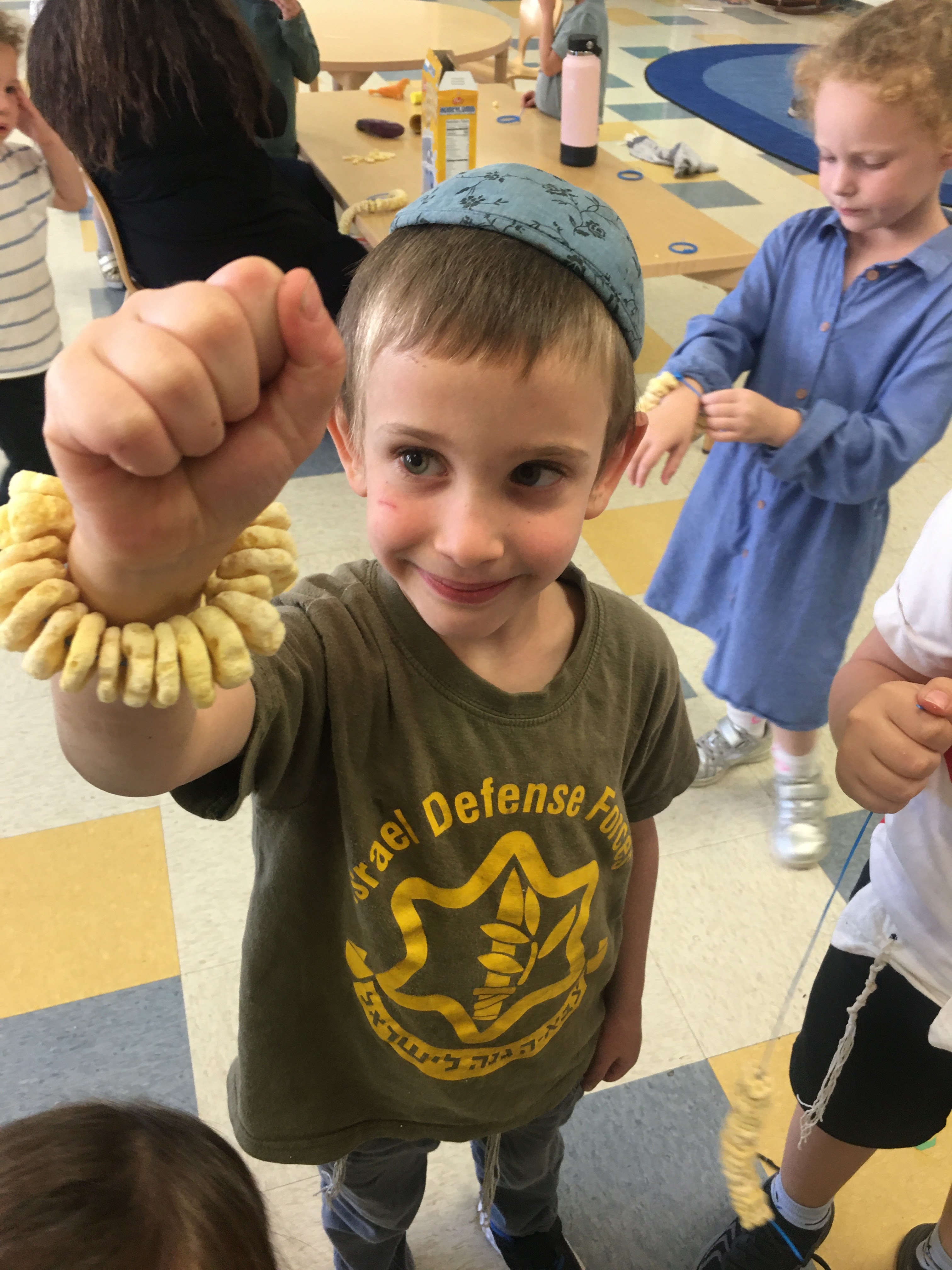 When the kids walk in the class, wearing crowns, we greeted each one by blowing the shofar.